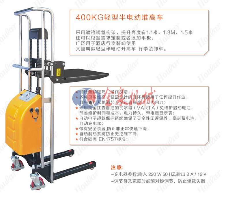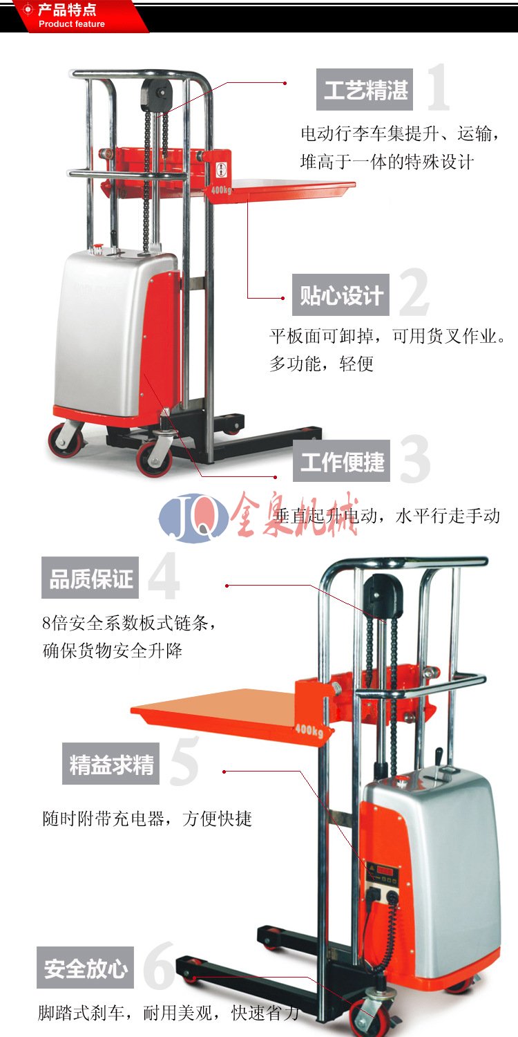 金泉輕型半電動堆高車采用:1.高品質(zhì)電動泵站,操作輕巧省力 2. 免維護電池,電池持久,3.帶電量顯示 4.車架多層鍍鉻工藝,美觀耐用 5. 內(nèi)置式充電口,充電方便安全