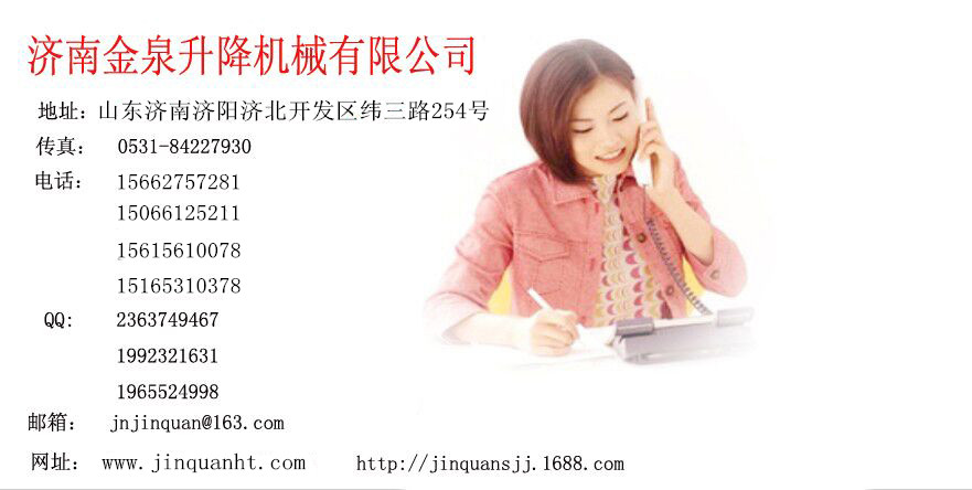 公司名稱:濟南金泉升降機械有限公司 公司地址:山東濟陽縣濟北開發(fā)區(qū) 電話:0531-84227930 手機:15165310378