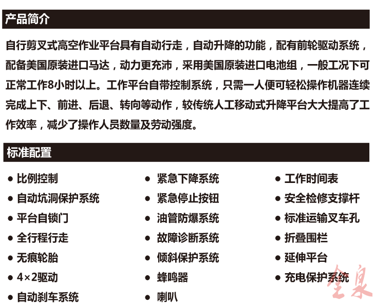 自行剪叉式升降平臺移動靈活、操作方便、省工、省力、令高空作業(yè)更方便快捷,是現(xiàn)代企業(yè)高效安全生產(chǎn)之理想的高空作業(yè)設(shè)備。高空作業(yè)平臺使許多困難危險的工作變得更加容易化,例如:室內(nèi)外清潔(天花板,幕墻,玻璃窗,屋檐,雨蓬,煙囪等),廣告牌的裝置和維護,路燈和交通標志的裝置和維護等。這種高空升降平臺的特點是小巧靈活,方便快捷??梢杂靡徊可灯脚_代替腳手架來達到您需要的高度,解決您的難題。同時,還可以節(jié)省您的費用和寶貴的時間。